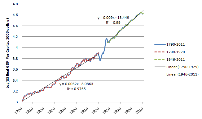 Using the data from http://www.measuringworth.com/usgdp/ (http://www.measuringworth.com/usgdp/), I did two separate fits for 1790-1929 and 1946-2011, skipping the Great Depression/WWII fluctuation. These confirm your observation that the post-WWII data is smoother (higher R²) and has a higher slope.